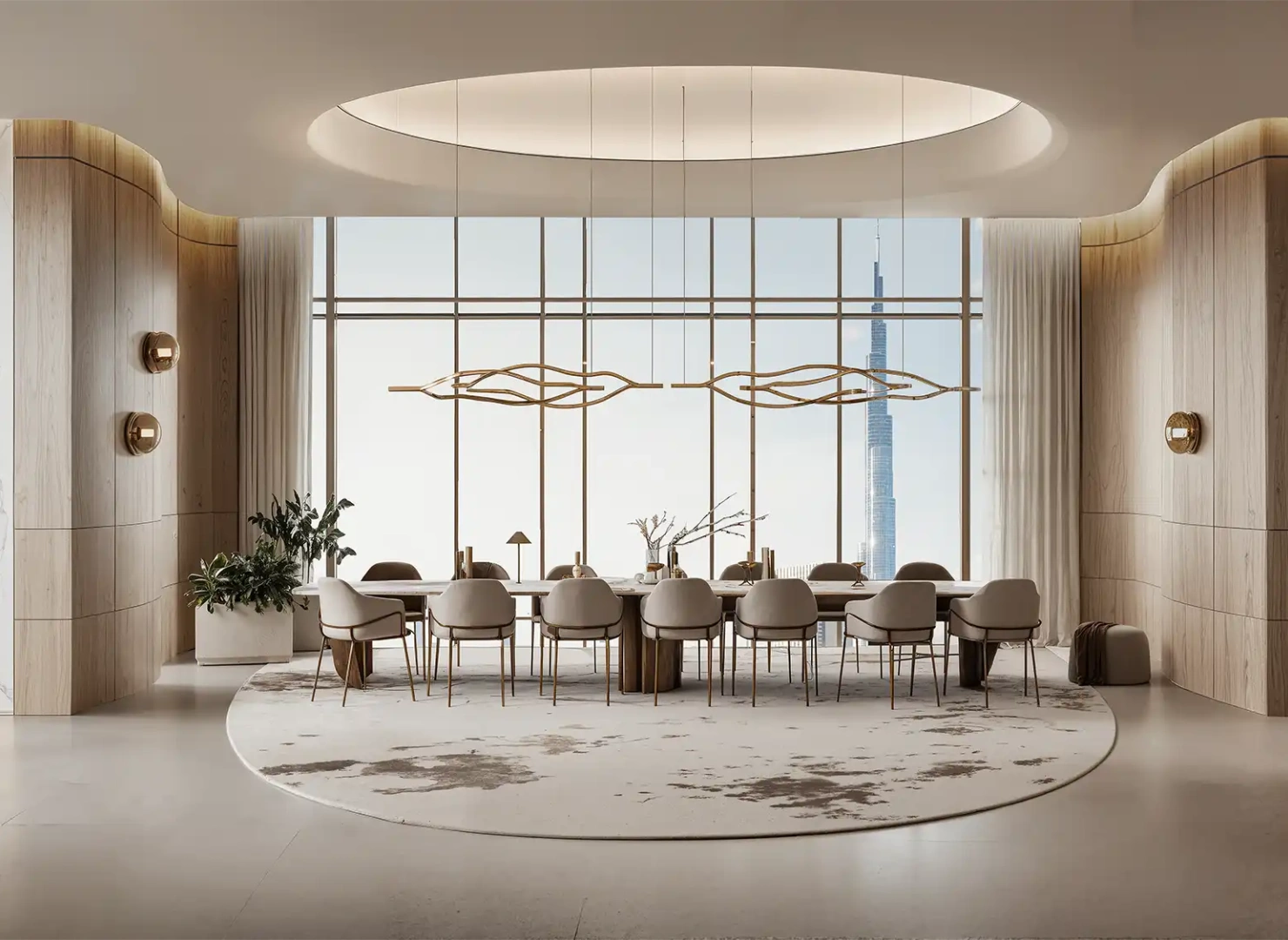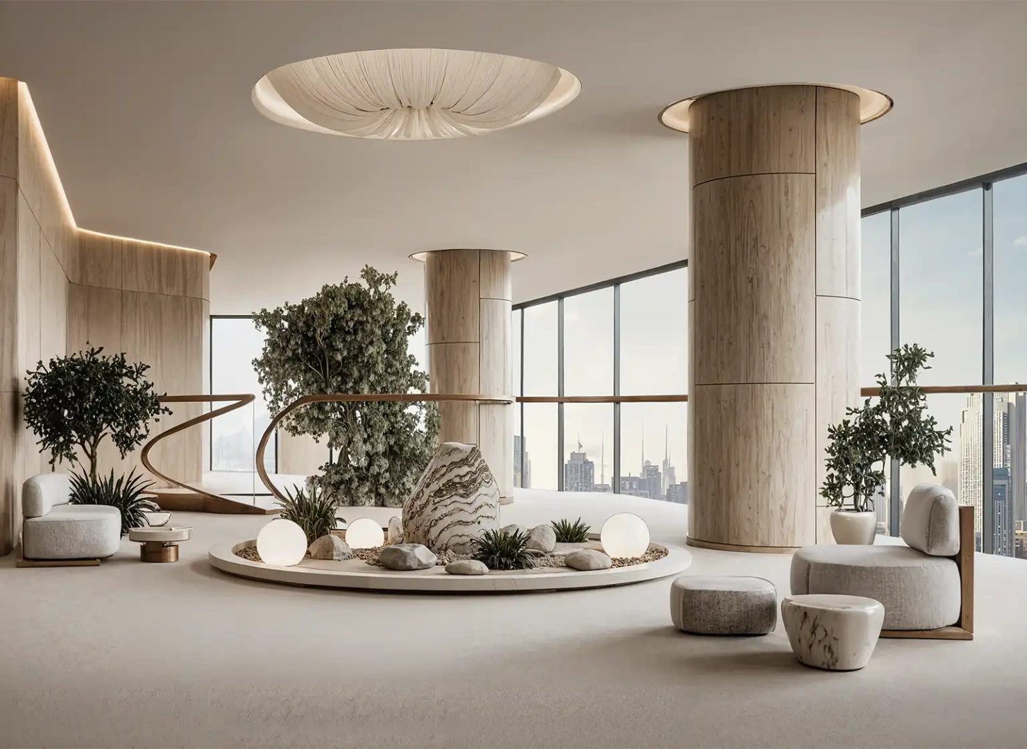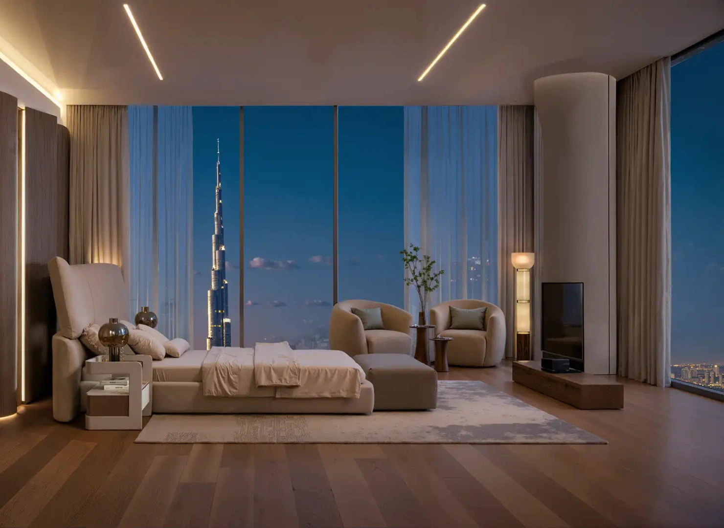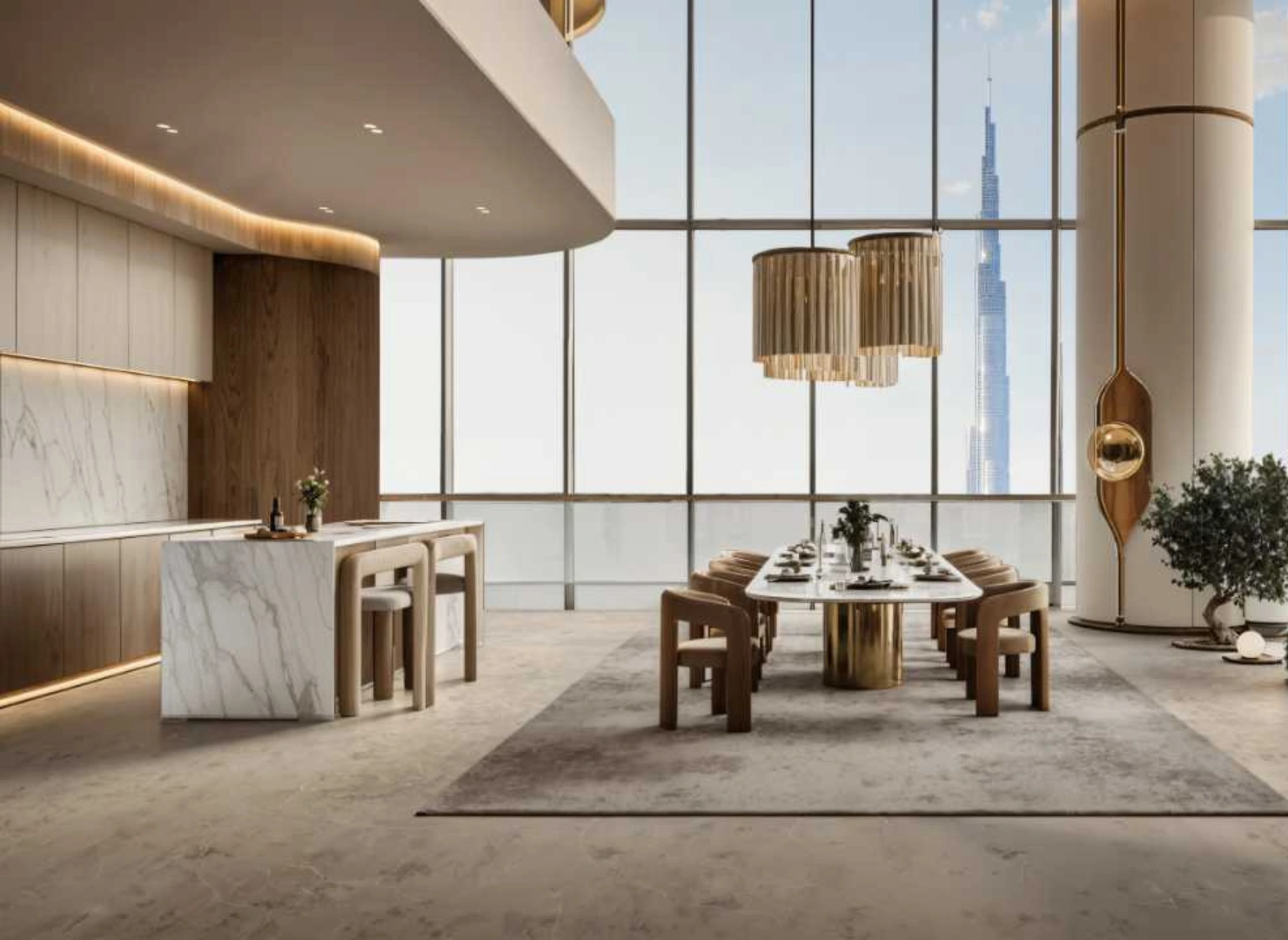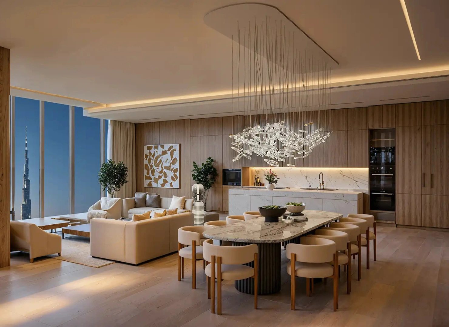 These twin towers are united by a dramatic vertical glass slit that reflects panoramic views by day and glows with dynamic light at night. Beyond their impressive exterior, the interiors are sculpted with warm stone, wood, and metallic accents—infused with modern Arabian elegance.