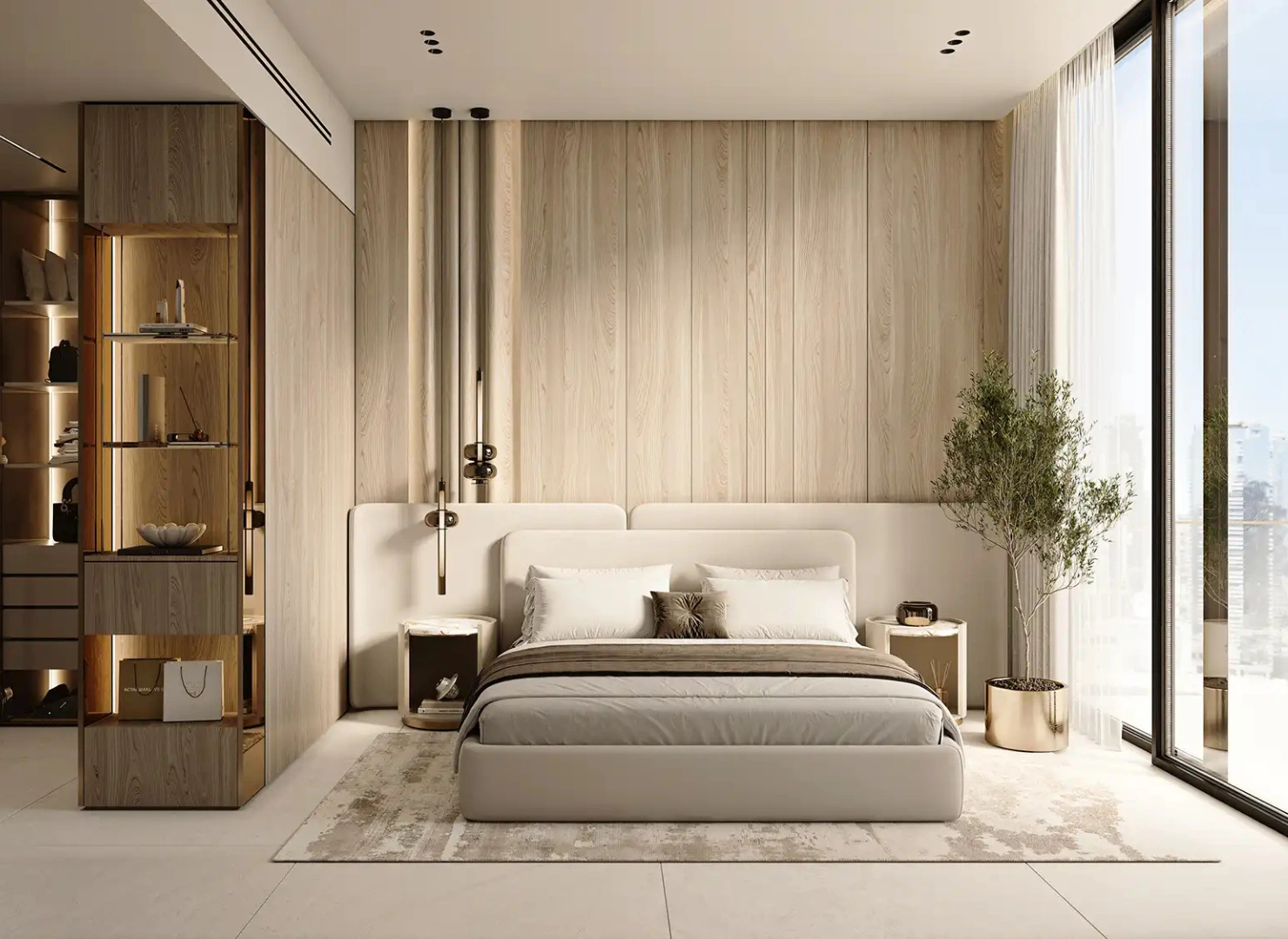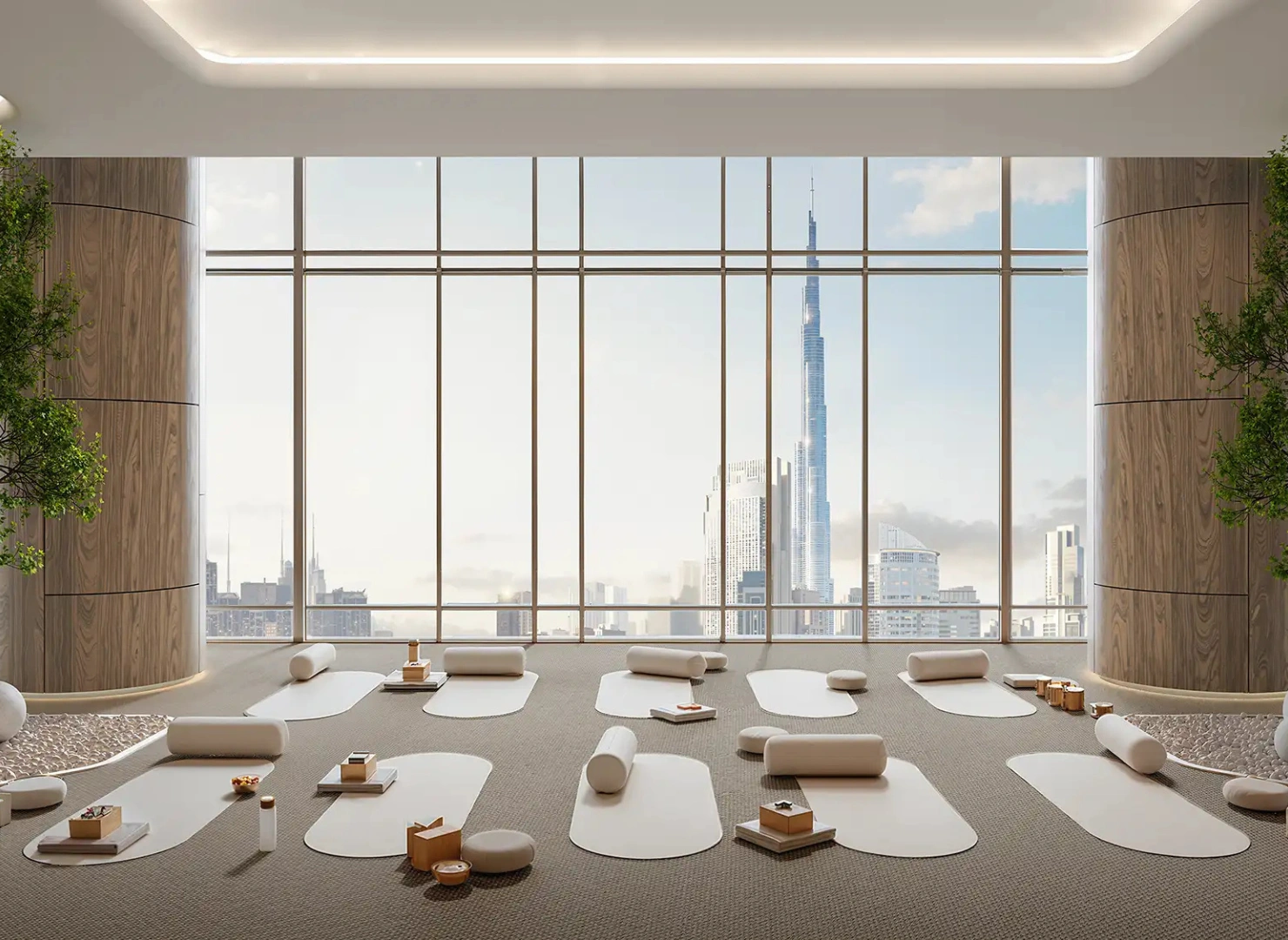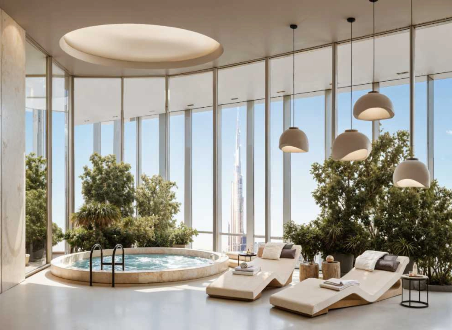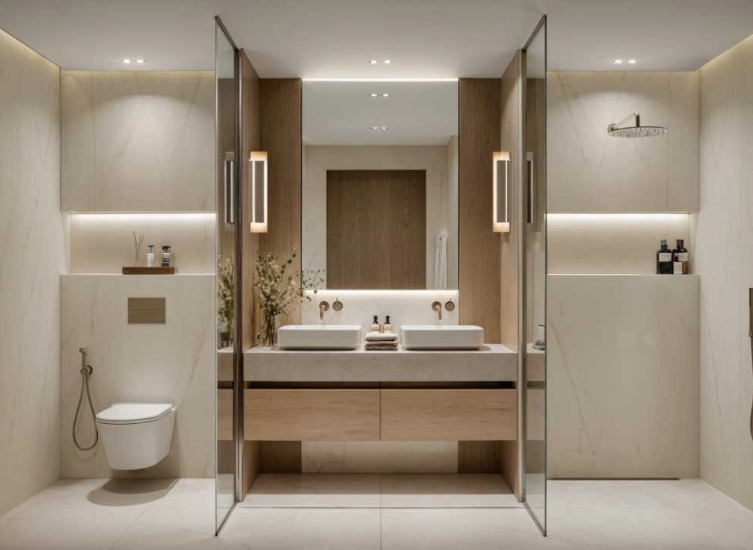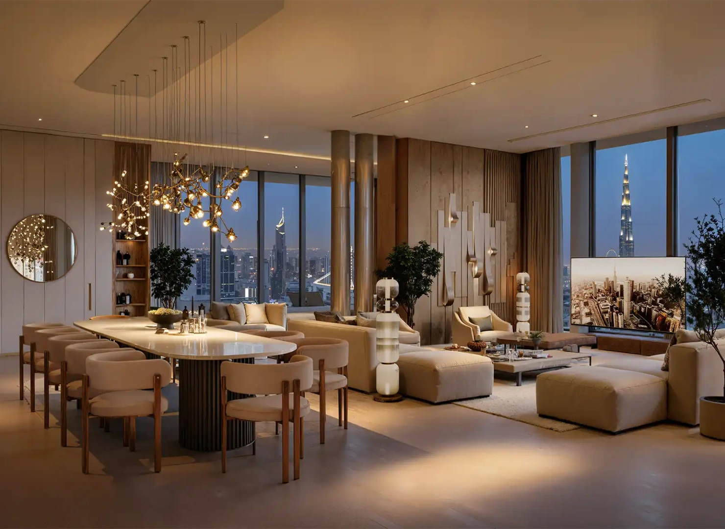 These twin towers are united by a dramatic vertical glass slit that reflects panoramic views by day and glows with dynamic light at night. Beyond their impressive exterior, the interiors are sculpted with warm stone, wood, and metallic accents—infused with modern Arabian elegance.
