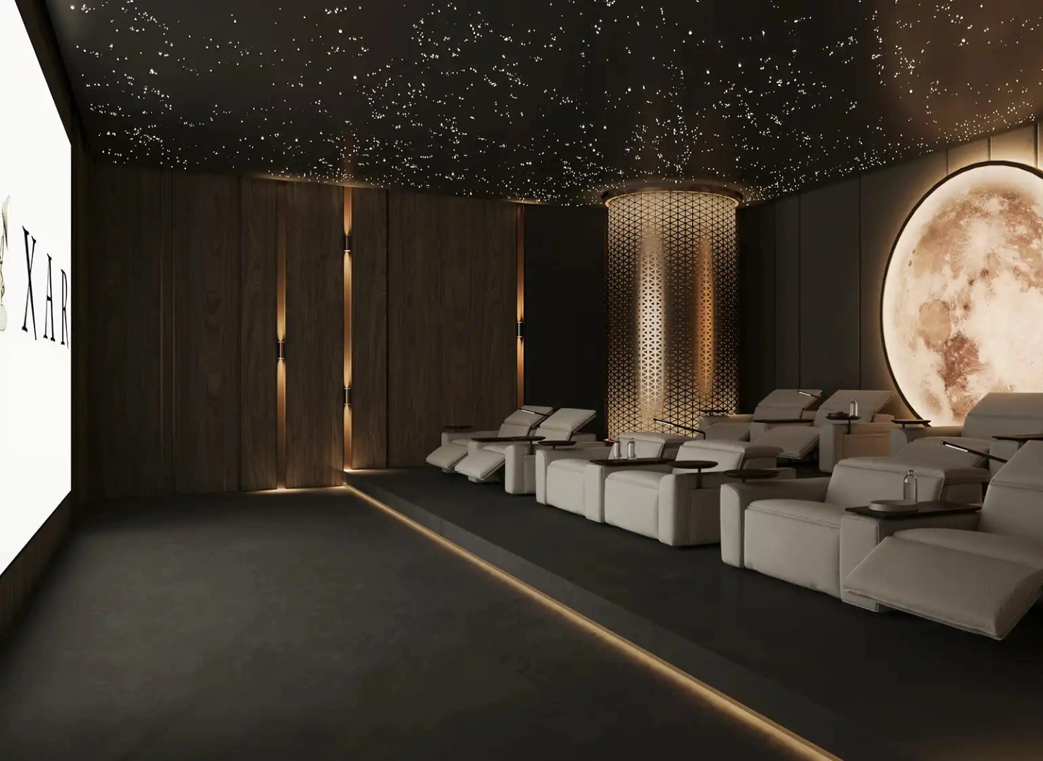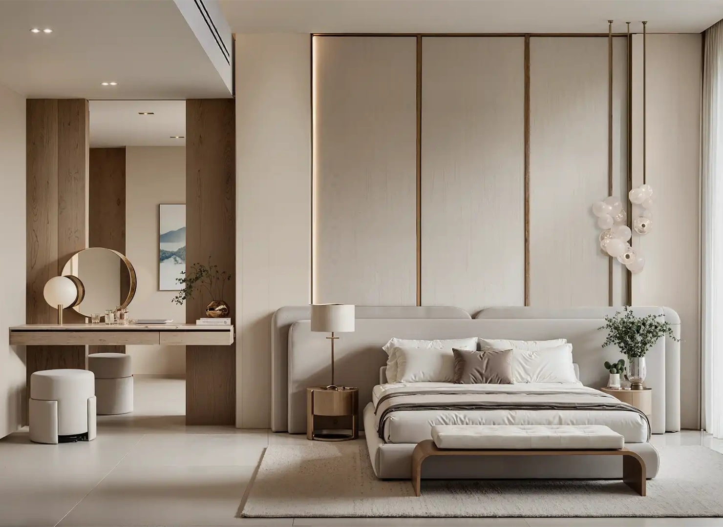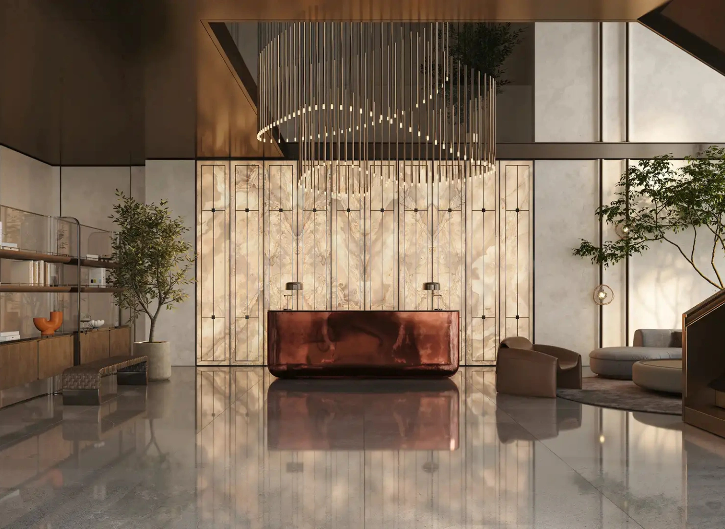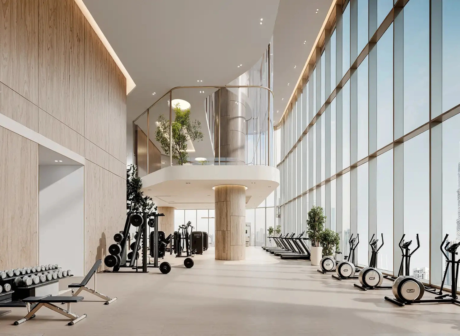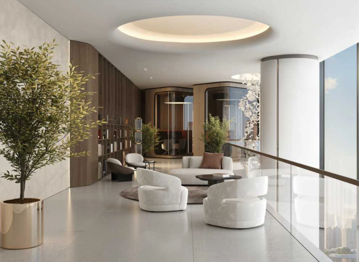 These twin towers are united by a dramatic vertical glass slit that reflects panoramic views by day and glows with dynamic light at night. Beyond their impressive exterior, the interiors are sculpted with warm stone, wood, and metallic accents—infused with modern Arabian elegance.